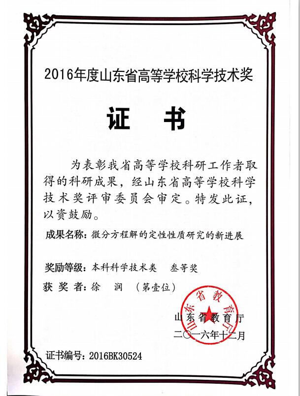 2016年12月徐润获山东省高等学校科学技术奖三等奖