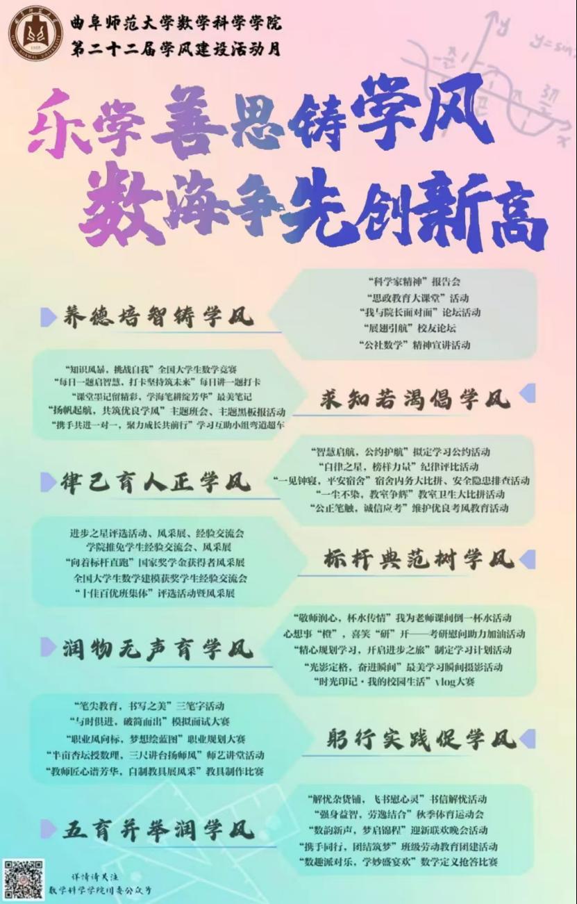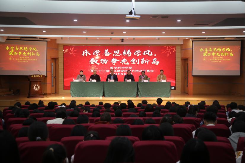 此次学风建设月活动聚焦学生在学业规划、学习动能、实践技能、学业重负中的渴望与困惑,响应学院在学风塑造、人才培育、文化续脉的迫切追求。以立德树人为根本,学风建设为核心,以“乐学善思铸学风,数海争先创新高”为主题,共分为“养德培智铸学风”“求知若渴倡学风”“律己育人正学风”“标杆典范树学风”“润物无声育学风”“躬行实践促学风”“五育并举润学风”七个模块。通过举办各种特色活动,加强数学思想教育,引导学生树立远大理想、传承科学精神,激发学生对数学专业的热爱和探索精神。引领学子们锚定学业航向,锤炼学习筋骨,舒缓学业压力,为学生成长成才强基赋能,致力于织就一袭乐学善思、严谨勤勉、全面发展、强国有我的学风长袍,优化巩固立体化、精细化、全程化的学风育人体系。