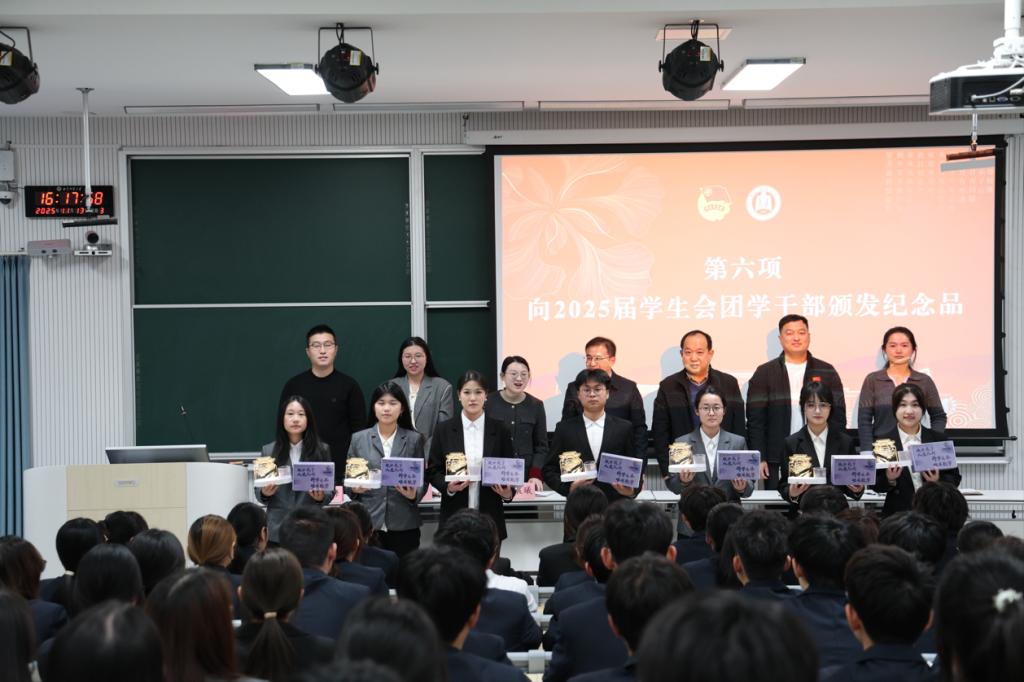领导老师们为2025届学院学生会代表暨2024-2025学年“青马工程”培训班优秀学员代表发放了校园文创纪念品,并向学院第一批基层团支部“团建指导员”颁发了聘书。随后,“青马工程”培训班全体成员进行庄严宣誓,铿锵誓言回荡现场,展现了青年骨干对马克思主义的坚定信仰。