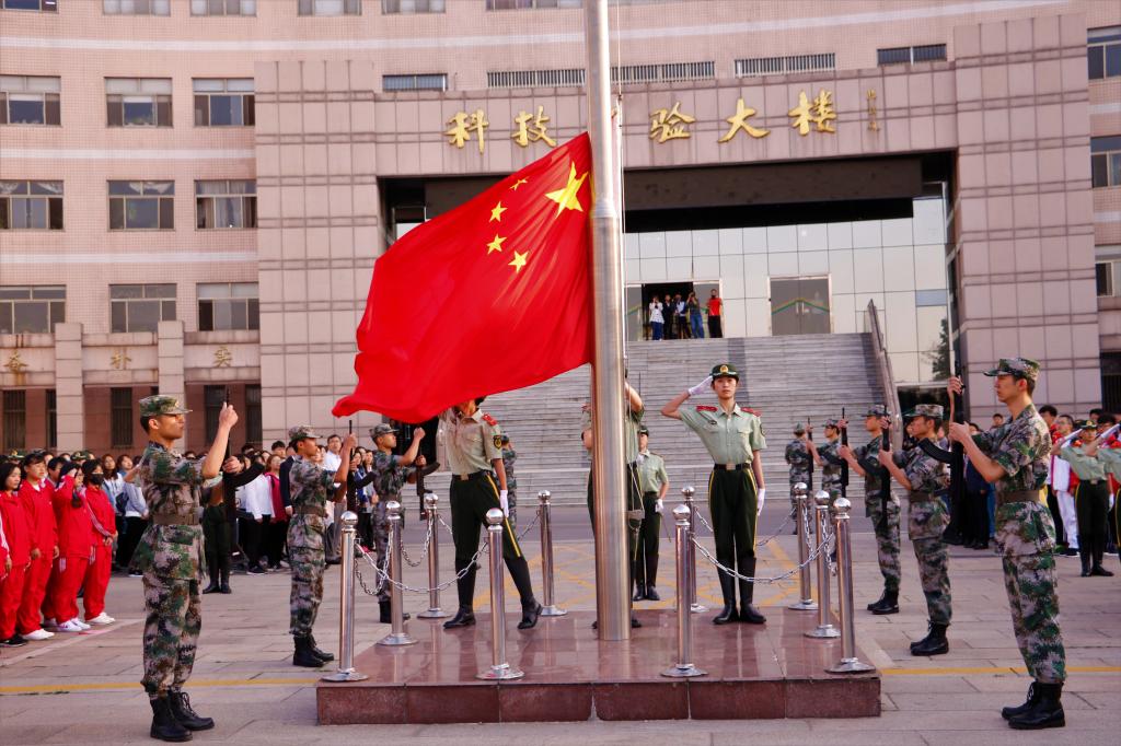 全体2017级学生带着崇高的敬意,肃立在升旗台前,精神饱满的等待升旗仪式的开始。六点半整,英姿飒爽的国旗护卫队迈着铿锵有力的步伐,护卫着五星红旗,从远方走来,升旗仪式正式开始,全场肃然起敬,行注目礼。激昂的《义勇军进行曲》缓缓奏起,承载着民族理想的五星红旗,冉冉升起,随风飘扬。随后面对着象征青春与热血的团旗,我校全体学子举起右手庄严宣誓,发出“必将为共产主义事业奋斗终生”的青春誓言,洪亮的声音响彻曲园。