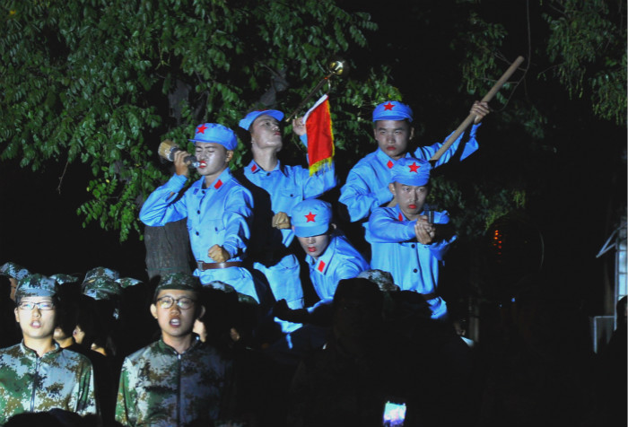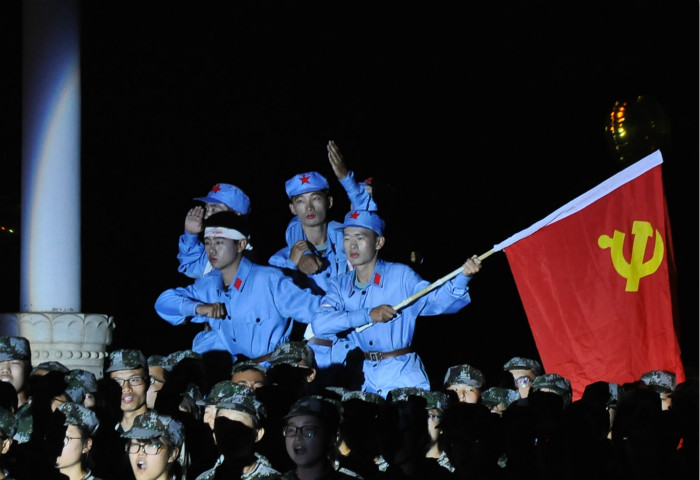 压轴登场,振奋人心的开场,嘹亮的歌声,庄严的指挥,鲜红的旗帜,缤纷的礼花,自信的口号,整齐划一的动作,惟妙惟肖的人物塑像等无一不彰显着炸金花