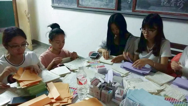 2014、2015级各班便开始准备这封意义非凡的书信。同学们从大学学习方法、课外活动、同学间相处、日常生活注意事项等方面将自己的大学生活经验传授给师弟师妹们,可谓面面俱到,亲笔手写的字迹更是令真心的祝福跃然纸上。书信收集完毕,学生会成员们将信装进精美的信封中,贴上爱心标志,一封封亲手送到新生宿舍,妥善安置在每个书桌上。