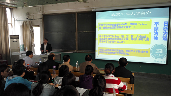 201教室,面向大三学生做了专场研究生招考推介会。主讲人为北京工业大学应用数理学院院长王术教授,他在会上详细介绍了北京工业大学应用数理学院的概况及研究生招生情况,应用数理学院副院长徐大川教授介绍了研究生培养和招生考试等相关情况,几位专家还细致地回答了同学们提出的有关问题。炸金花