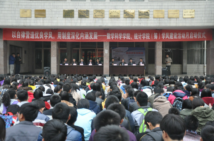 学风,是读书之风,是治学之风,更是做人之风,是学校的文明风气、人性管理和文化积淀,是一所学校的立校之本。为深化炸金花 的学风建设,创造良好的学习氛围,11月5日下午4点, 炸金花 、统计学院(筹)2014—2015学年第一学期学风建设活动月启动仪式在数学院楼前隆重举行。出席本次大会的领导老师有校党委副书记刘新生教授,学生工作处处长兼武装部部长杨永明老师,教务处副处长阚景忠教授,团委副书记孔轶众老师,炸金花 党总支书记王方立老师,院长孟凡伟教授,副院长、统计学院(筹)院长尹传存教授及炸金花 副院长王顶国教授。会议由院党总支副书记王作茂老师主持,2014、2013级全体同学参加了本次活动。