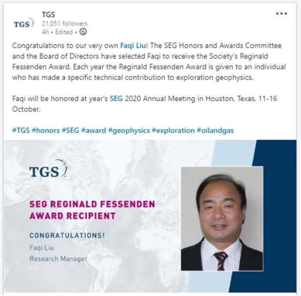 曲阜师大炸金花讯 曲阜师大数学系82级校友刘法启今年被国际勘探地球物理学会(Society of Exploration Geophysics (SEG))授予Reginald Fessenden Award,这个奖项至今只有四位华人地球物理工作者获得。由于在地震波叠前偏移成像算法中的工作, 刘法启今年成为第五位获得这个奖项的华人地球物理工作者。该研究把逆时偏移算法中的低频噪音的产生机理进行了系统的理论分析和阐释, 并提出了一种快速稳定的算法将其与有效信号成功分离。该研究发表在地球物理杂志《Geophysics》上,后被很多研究人员引用, 并被广泛应用于地震波偏移成像和全波形反演工作中。