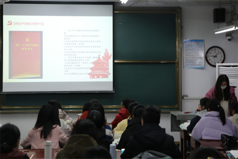 团课伊始,各班团支书带领同学们观看党的二十大精神微课。接着团支书们从党的二十大精神学习背景、意义、主题等几个方面进行阐述,带领同学们从党的二十大报告中感悟精神实质。此外,各团支部全体团员、入团积极分子紧紧围绕“强信念、跟党走”主题,深入开展党的理论学习教育,在每周规定的时间里,将学习内容和心得体会在班级里进行分享、交流,确保党的理论学习教育取得扎实成效。