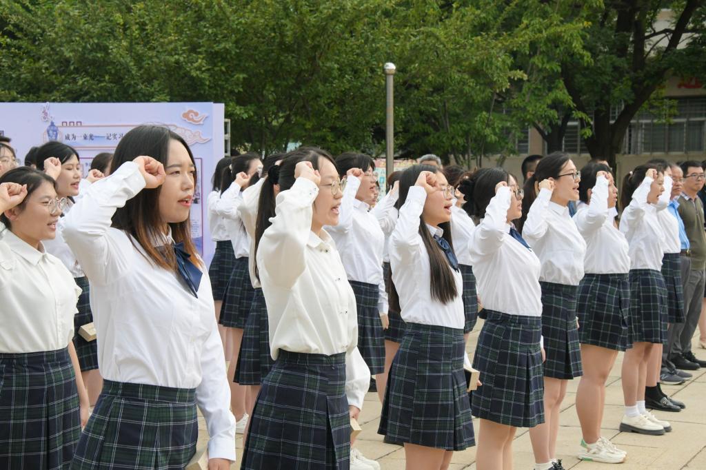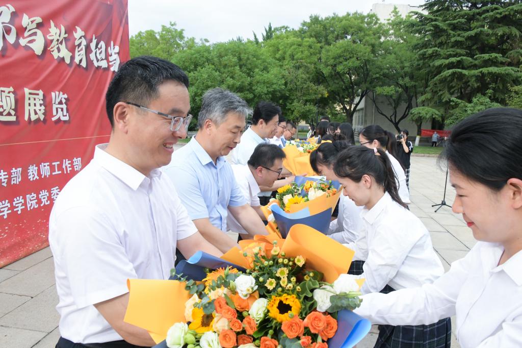 出席开幕式的领导和嘉宾向“最美教师”荣誉称号获得者颁发习近平总书记关于师德师风重要论述纪念牌。全体毕业生行“谢师礼”表达敬意与感激之情。出席嘉宾向学生赠送毕业纪念品,希望毕业生坚守师德,践行使命。全体毕业生为出席活动的领导老师献花,鲜花从最后一排同学手中,依次传递至最前排,代表着全体同学对老师的真诚感恩。最后,即将走上教师岗位的全体毕业学子同诵《人民教师誓词》,在铮铮誓言中表达了厚植师道精神、“躬耕教坛、强国有我”的信念与决心。