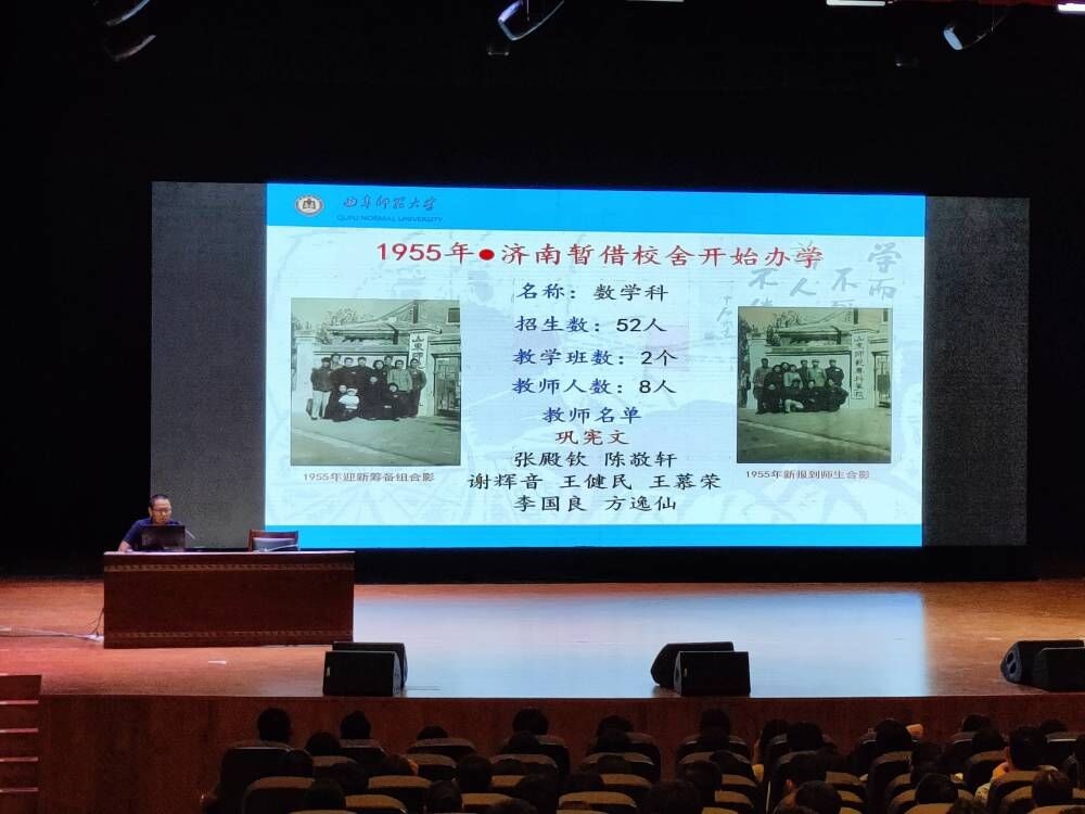 学院数学研究所副所长许勇军老师带领学院2023级新生回望了六十七载曲园数学记忆。他从筚路蓝缕的办学历程、引以为傲的公社数学、兼容并包的学术交流、不忘初心的发展壮大四个方面介绍了学校数学学科的发展历程。从1956年的“建立次年曲阜安,北上南下忙招贤”到1972年的“复旦赠送一零三,如获至宝日夜伴”,再到如今的数学与应用数学专业首批入选国家级一流本科专业建设点和信息与计算科学专业入选山东省一流本科专业建设点,许勇军通过对学院历史的回顾,向同学们总结了“蹄疾步稳、犁牛之子”的数科人精神,并勉励同学们以老一辈数科人为榜样,锐意进取、开拓创新、注重诚信、敢争一流。