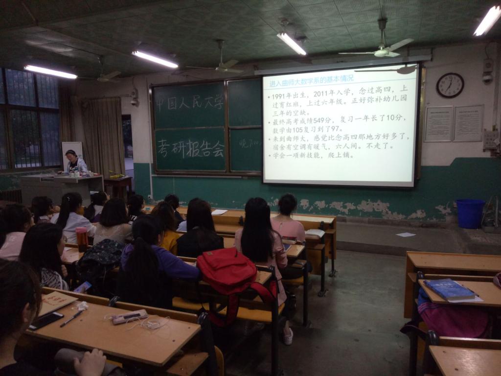 杜祯敏同学从自身考研经历出发,围绕如何选取专业和院校、指定复习计划、调整心态以及复试中的注意事项等方面谈了自己的亲身体验和感受。她提出了在政治、英语以及专业课复习上的具体可行的方法,如对于数学分析的学习要重点考察解题的思路,不要过分纠结于细节。此外,她还详细的介绍了中国人民大学信息学院的研究生学习、生活、就业情况,以及中国人民大学的信息学及数学科学研究院的情况。并且,还对中国人民大学实验室发展建设情况,学术科研情况,暑假夏令营,研究生招考及存在的风险都做了详细介绍,让同学们对当前的考研形式有了深刻的理解,对中国人民大学的考研政策有了一定的认识。