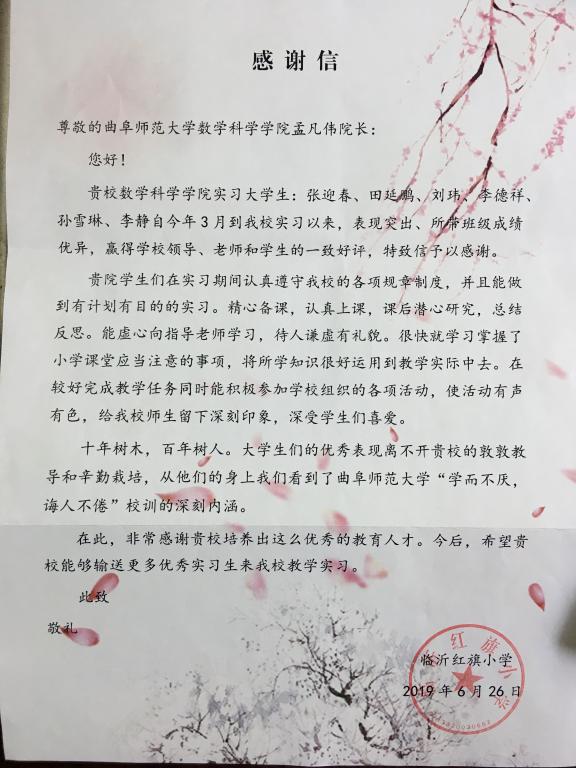 2016级222名数学专业师范生奔赴日照市的五莲县和莒县,临沂市兰山区,以及济宁市的汶上县、鱼台县、梁山县和金乡县共计7个地市参加顶岗实习支教。7月4日,学院全体师范生圆满完成一个学期的顶岗实习支教任务并顺利返校。