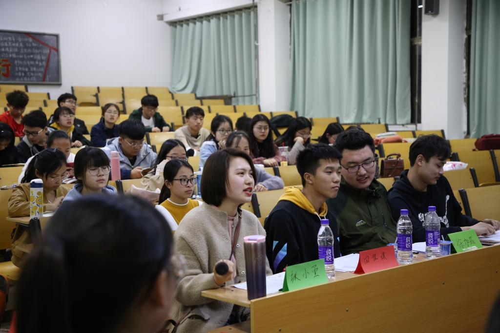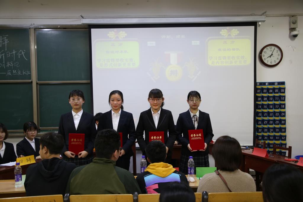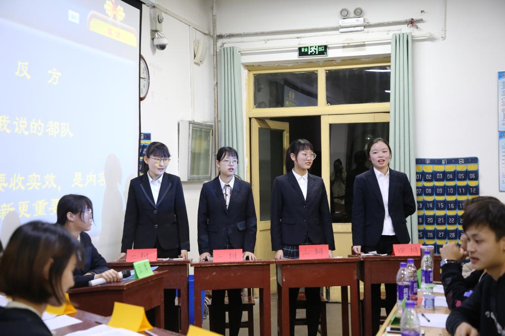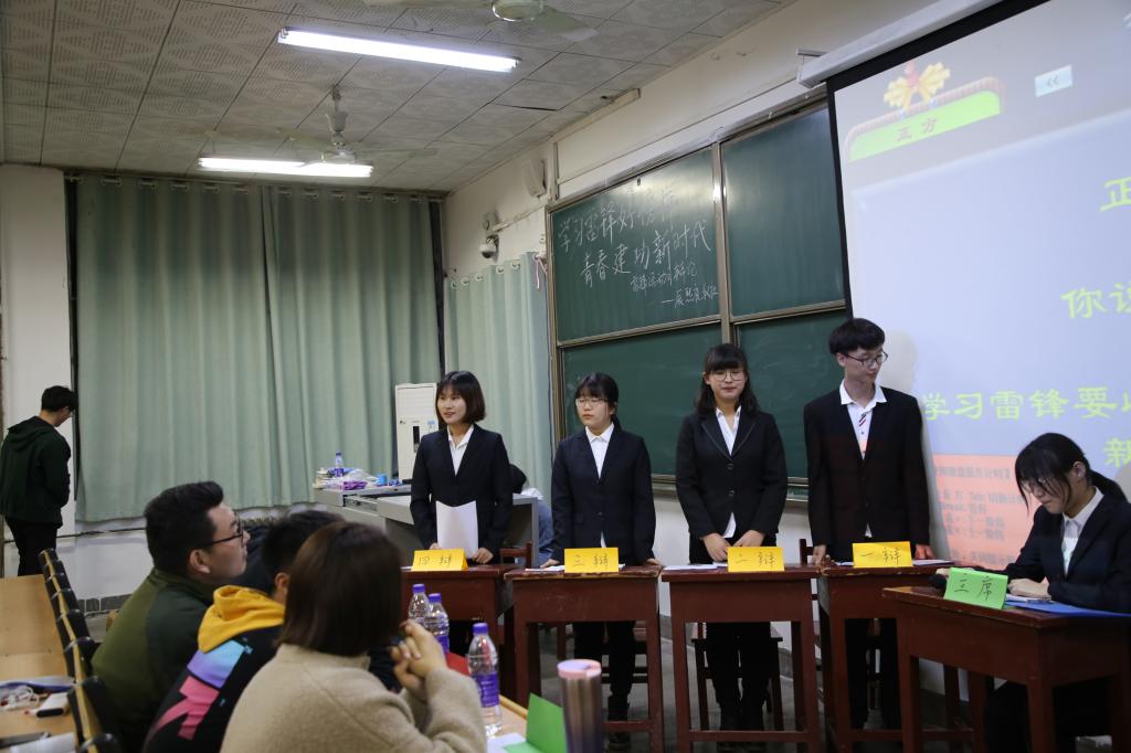 201教室举行。上届取得优秀成绩的辩手张小萱、田佳琪、徐加成和吴亚坤四位同学担任了此次辩论赛的评委。