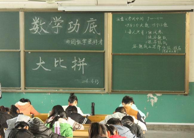 11月13日上午9点,由炸金花 学生社团联合会和数学与统计学院团委联合主办,曲园数学爱好者协会承办的“数学功底大比拼”活动笔试初赛在数学教学楼201教室顺利进行,2016级部分同学参加了本次活动。