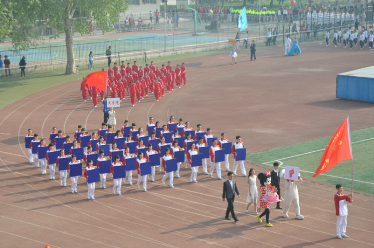 代表队踏着整齐的步伐接受了全校师生的检阅。两位装扮成卡通人物的同学手举校庆图标和创意蛋糕活泼地走在炸金花