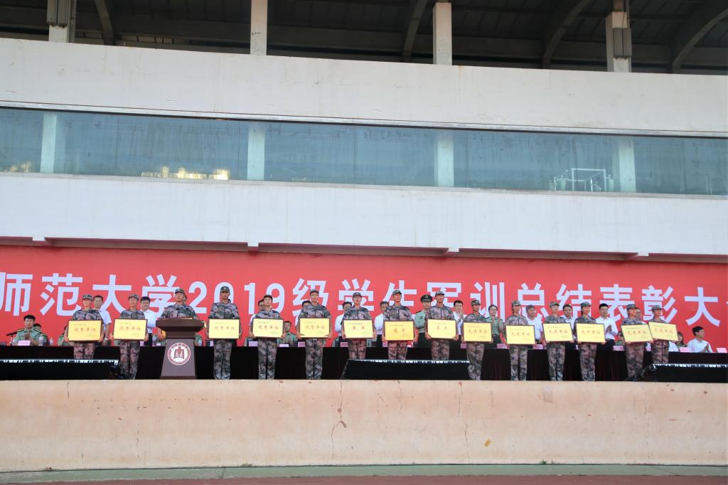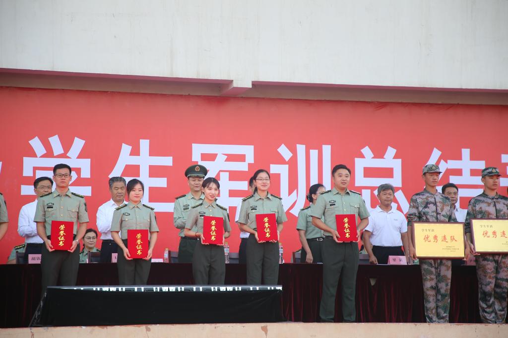 荣获军训工作优秀单位称号、拔河比赛亚军、优秀连队三营三连,表彰徐腾飞为优秀辅导员,在主席台就坐的领导为获奖代表颁发了奖牌和证书。