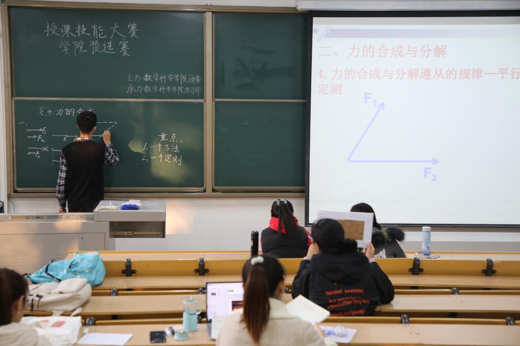 活动伊始,主持人做开场祝词,提出“久育良师六五载,技能争锋三尺台"的竞赛主题。选手们从中学学段选取课题,通过利用PPT、板书和提问等方式进行授课,充分调动听者的积极性和课堂的活跃性。选手在讲台上举止得体、仪表落落大方,讲课过程声情并茂,整场比赛俨然是一场精神上的盛宴。经过一番角逐,18级师范三班徐嘉利和19级公师班邓佩颖获得本次比赛的一等奖,两位亦将代表我们学院参加校级比赛。