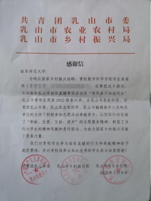 学子姜竣祥在乳山市委组织部、共青团乳山市委、乳山农业农村局、乳山市融媒体中心及相关单位的支持下积极参加志愿活动奉献家乡,利用寒假返乡课余时间主动参与乳山市助农直播带货并积极参与“等风来不如追风去”乳山市青年志愿者2022新春庆典,彰显了曲园学子勇于担当、乐于奉献、崇德向善的良好风貌。