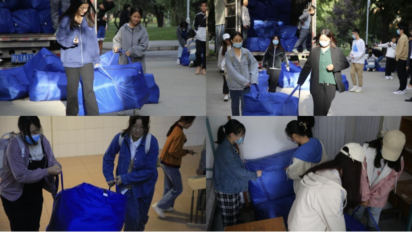 搬运分发现场,同学们互帮互助、协同合作,有序将被褥从货车搬运分发到每一个新生宿舍,为新生提供贴心的服务,保证新生入学后顺利入住。搬运分发过程分工清晰、高效有序。最终,在大家的共同努力下,工作得以圆满完成。