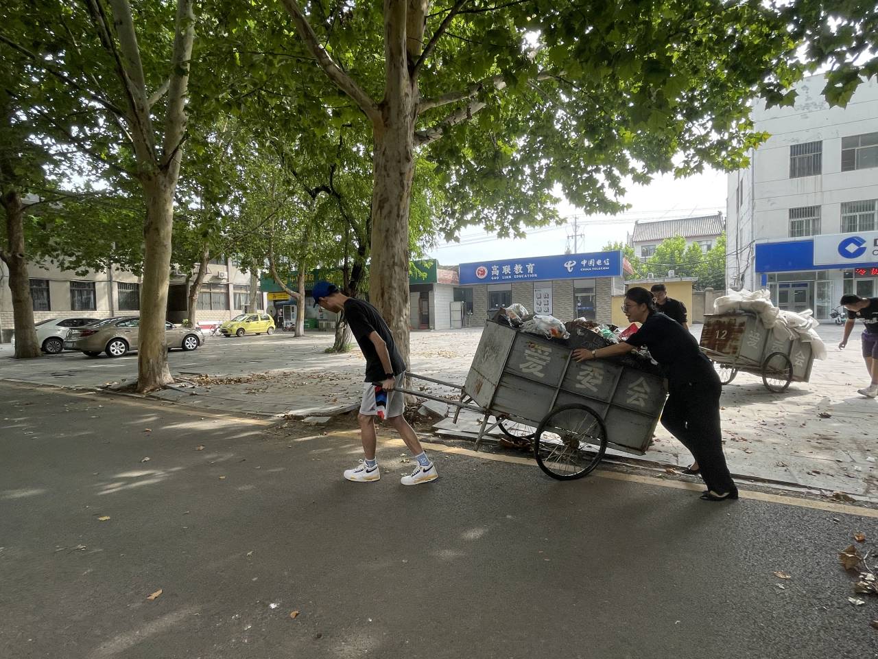 有的进入绿化带捡拾落叶,有的负责清扫路面,有的来回清运垃圾,大家相互合作,确保卫生不留死角。