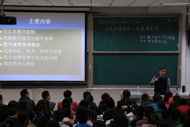 讲座伊始,刘教授系统地介绍了数学建模的概念,并通过一系列的实例向同学形象地讲解了数学模型与数学建模的联系。为了让同学们对数学建模有一个全面且正确的认识,他不仅通过PPT的形式就竞赛组队、报名、培训等赛前准备工作对我们提出了科学且中肯的建议,更将竞赛的注意事项及数学建模竞赛中常见的问题详细列举出来为同学们一一解答,并为大家推荐了有关建模的教材与网址,让同学们能够更好地学习数学建模,研究数学建模。